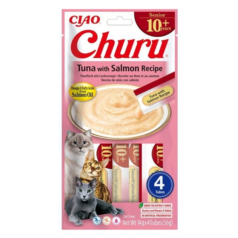 Churu Senior Receta de Atún con Salmón es un snack cremoso formulado para gatos de más de 10 años. Combina atún natural y salmón de calidad en una textura tipo puré muy fácil de lamer, ideal para gatos con dientes sensibles o pérdida de apetito. Con un 90% de humedad y solo 7 kcal por tubo, ayuda a mantener la hidratación sin sobrecargar de energía.