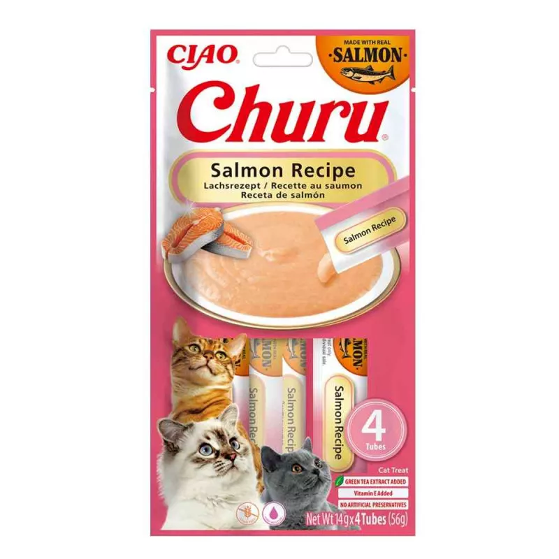 Churu Cat Receta de Salmón es un puré cremoso de alta palatabilidad elaborado con salmón real como ingrediente principal. Su fórmula aporta proteínas de calidad y ácidos grasos omega-3, mientras que su elevado contenido en humedad (más del 90%) contribuye a una mejor hidratación y al cuidado del sistema urinario y renal de tu gato.