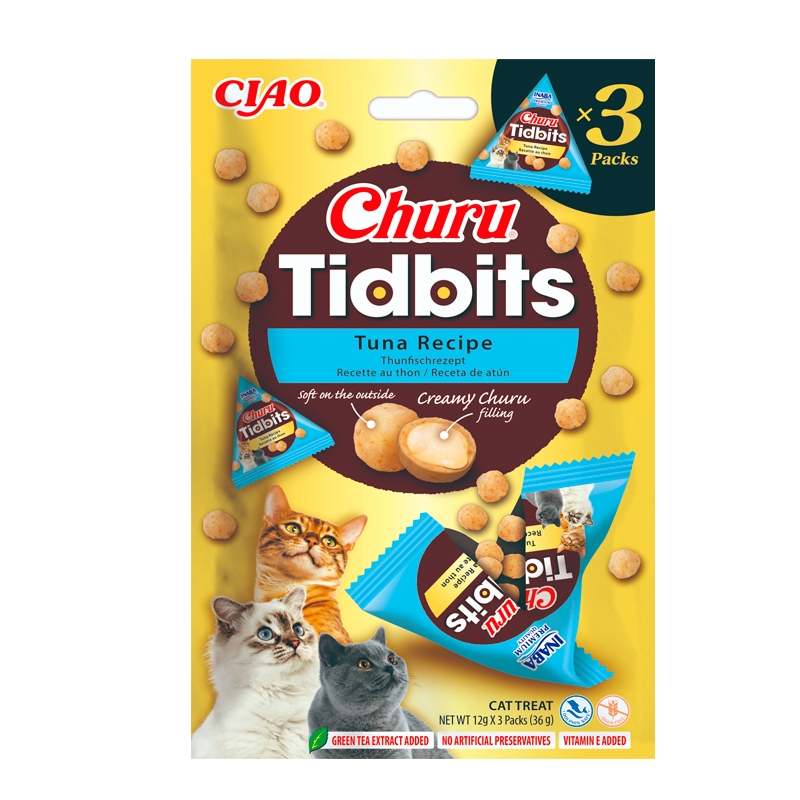 Churu Tidbits es un alimento complementario, por lo que debe ofrecerse como premio y no sustituir comidas completas. Ajusta la cantidad según el tamaño y actividad del gato.