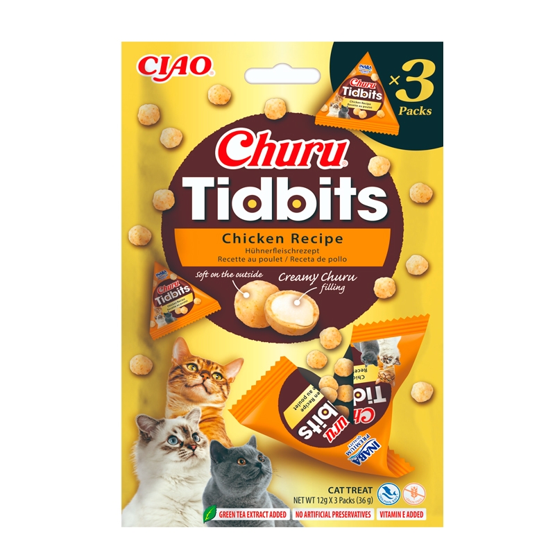 Churu Tidbits es un alimento complementario y debe administrarse como premio. Ajusta la cantidad en función del tamaño y nivel de actividad del gato.