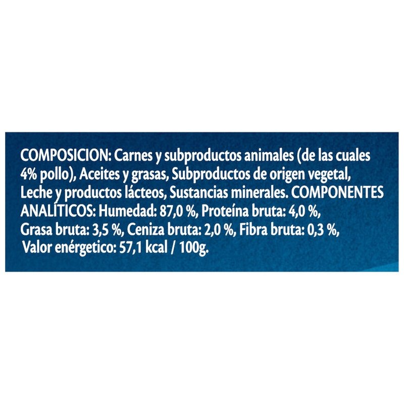 Composición: Carnes y subproductos animales (4 % pollo); aceites y grasas; subproductos de origen vegetal; leche y productos lácteos; sustancias minerales.