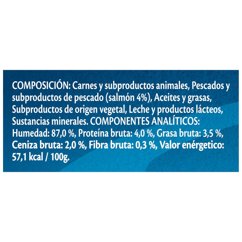 Composición: Carnes y subproductos animales; pescados y subproductos de pescado (salmón 4 %); aceites y grasas; subproductos de origen vegetal; leche y productos lácteos; sustancias minerales.