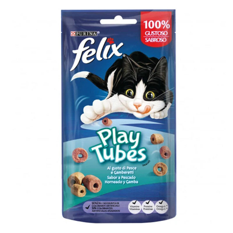 Descubre la manera más divertida y deliciosa de mimar a tu felino con los Felix Play Tubes Pescado y Gambas, ¡el snack que une sabor y diversión en cada bocado!
