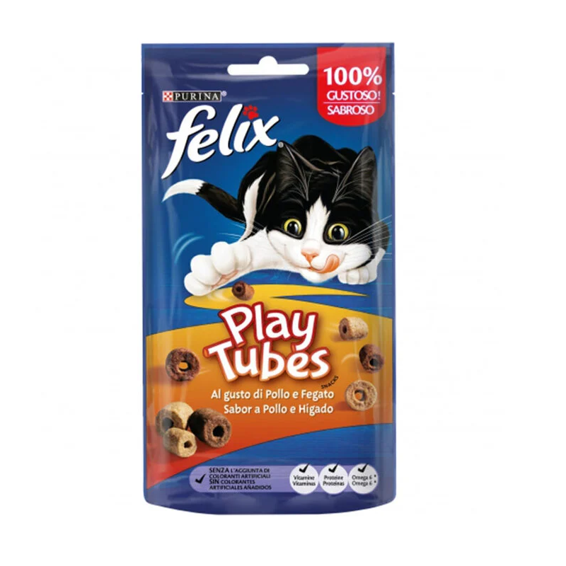 Haz que tu gato disfrute del mejor snack con los Felix Play Tubes Pollo con Hígado, ¡el premio perfecto para mantenerlo feliz y saludable!