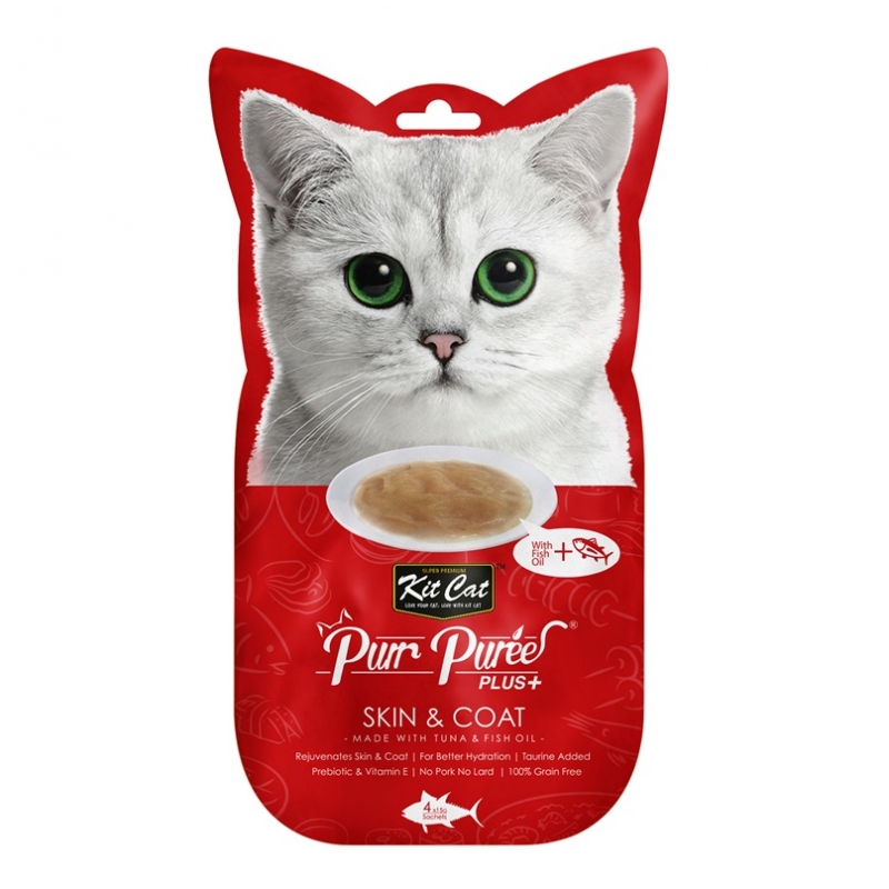 ¡Dale a tu gato un delicioso y saludable premio con Kit Cat Snack PurrPurée Plus Skin & Coat con Atún y Aceite de Pescado, un snack nutritivo que ayudará a mantener su pelaje suave, brillante y saludable!