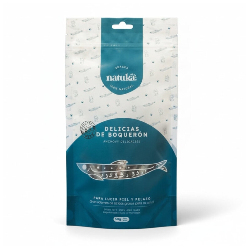 Snack natural de boquerón deshidratado para perros y gatos, rico en proteínas y Omega-3, sin aditivos y bajo en grasa; un premio sabroso que favorece piel y pelo.
