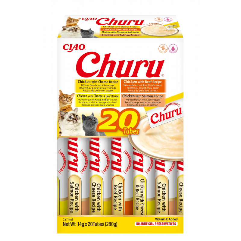 Irresistibles churus para tu felino, descubre las recetas de pollo con queso, con ternera, con queso y ternera y con salmón. ¡Un festín lleno de nutrición y sabor!