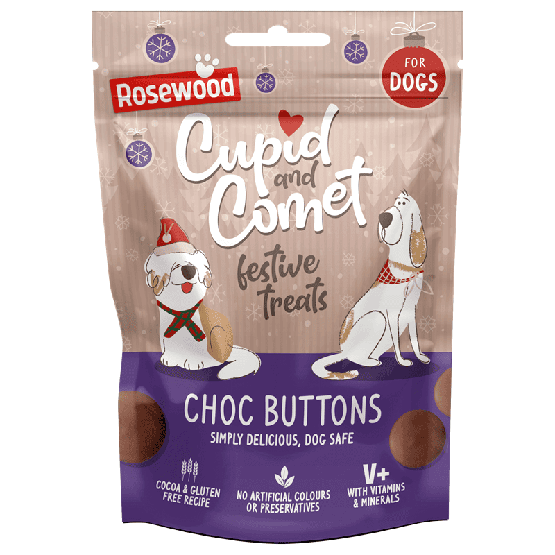 Golosinas festivas en forma de botones con sabor a chocolate, hechas con algarroba (4%) y enriquecidas con vitaminas A, D3 y E. Un snack navideño perfecto para perros.