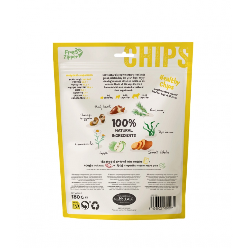 Healthy Chips Relax es un snack funcional pensado para complementar cualquier tipo de dieta (pienso, cruda o mixta) y aportar un extra de bienestar diario. Inspirado en la filosofía BARF, combina proteína animal con frutas, vegetales y superalimentos seleccionados.