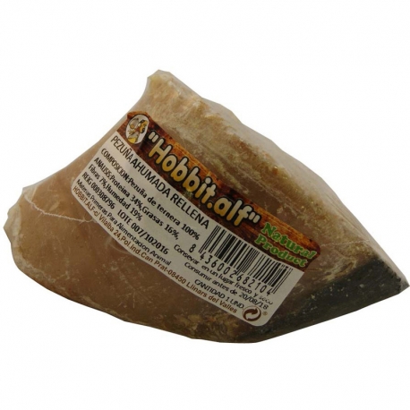 La Pezuña de Ternera Ahumada Rellena HobbitAlf es un snack 100% natural, libre de conservantes y colorantes artificiales, ideal para tu perro. Con su delicioso relleno de galleta natural y su exterior de pezuña ahumada, este snack ofrece una masticación saludable y entretenida, satisfaciendo el paladar de tu mascota mientras cuida de su salud dental y articular.