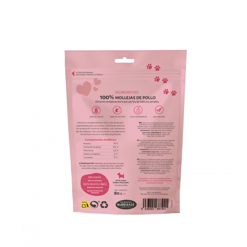 Las mollejas de pollo en daditos son un snack 100% natural creado para perros pequeños, con piezas en formato reducido para una masticación segura y cómoda. Su sabor suave y textura carnosa hacen que sea un premio ideal para el día a día.
