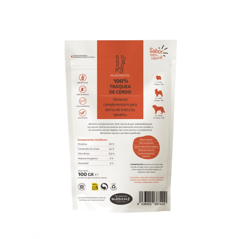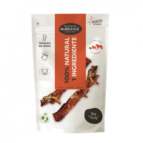La tráquea de cerdo es un snack 100% natural elaborado con un único ingrediente, pensado para ofrecer un premio sabroso y funcional. Su textura, firme pero flexible, resulta muy atractiva para perros que disfrutan del roer.