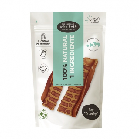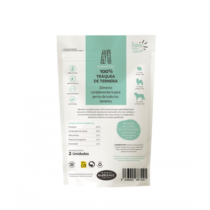 Snack 100% natural y monoproteico de tráquea de ternera deshidratada, pensado para perros desde los 3 meses como recompensa sabrosa y complemento cotidiano.