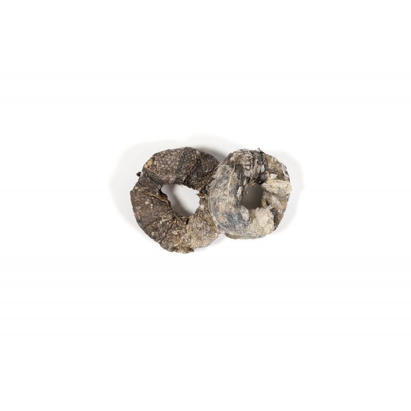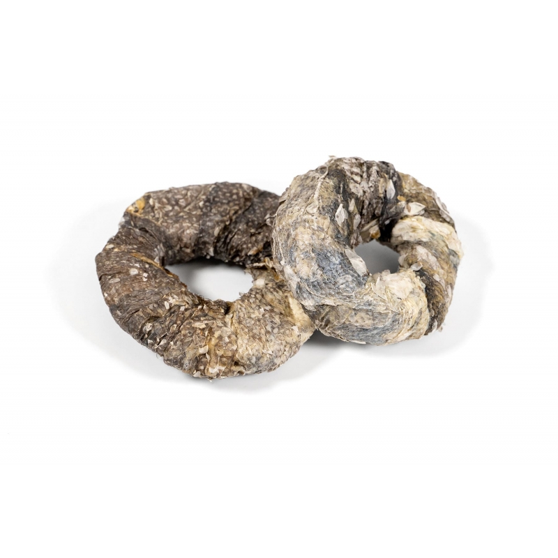Snack natural de anillos de piel de bacalao, rico en Omega 3 y proteínas, perfecto para mantener dientes limpios y un pelaje fuerte y brillante.
