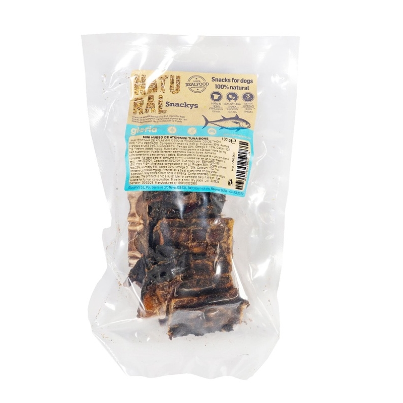 Snack natural al horno con espina central de atún, rico en Omega 3, calcio y colágeno, perfecto para perros pequeños que necesitan cuidar articulaciones y dientes.