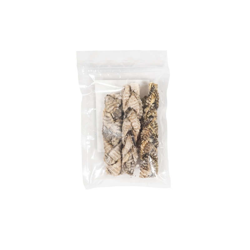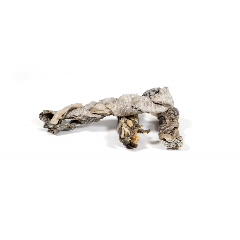 Las Trenzas de Piel de Bacalao combinan piel de bacalao deshidratada de alta calidad con una forma trenzada que entretiene y favorece la higiene dental.