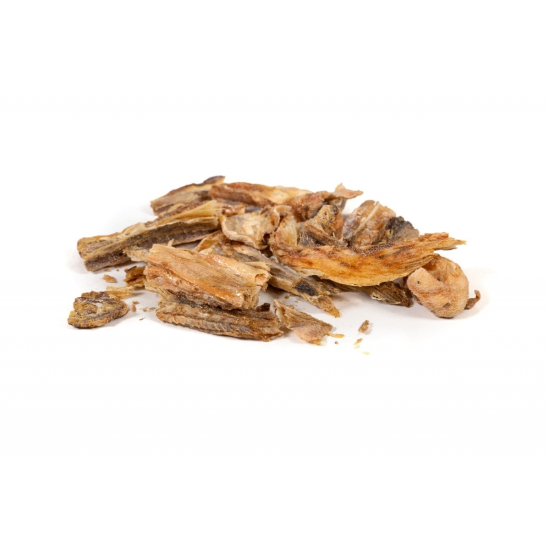 Bocados naturales de pescado deshidratado para perros, ricos en proteínas, Omega 3, calcio y fósforo, perfectos como premio saludable que contribuye al bienestar dental y óseo.