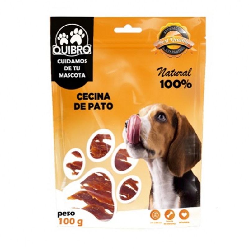 La cecina de pato para perros es un snack natural con pato como ingrediente principal, ideal para ofrecer un premio distinto, muy sabroso y fácil de administrar. Su textura semiseca permite partirla con comodidad y resulta práctica para perros de todos los tamaños, ya sea como recompensa diaria o en ocasiones especiales.