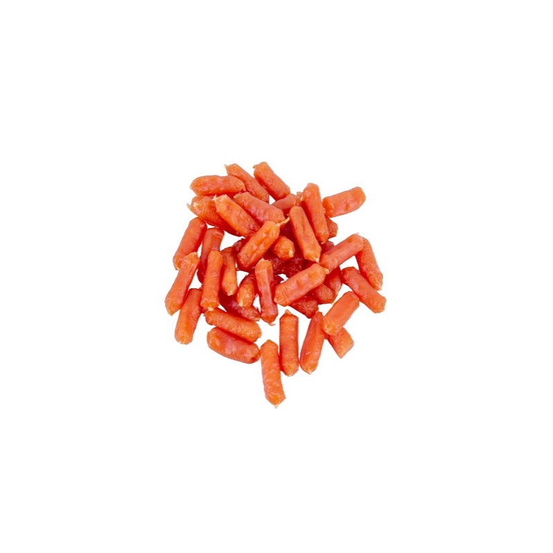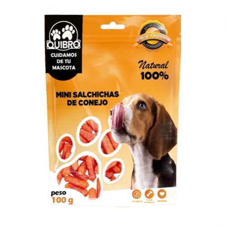 Snack natural de mini salchichas de conejo para perros, perfecto como recompensa deliciosa y aporte puntual dentro de una dieta equilibrada.