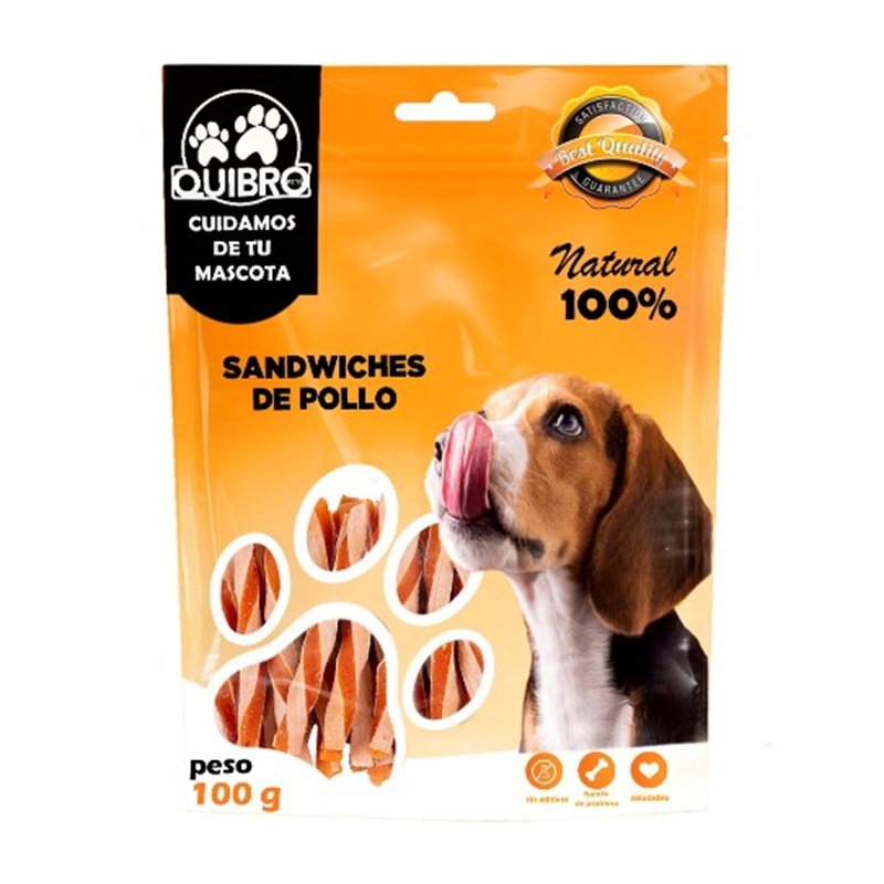 Los sandwiches de pollo para perros son un snack natural elaborado principalmente con pollo y bacalao, pensado para ofrecer un premio muy palatable y cómodo de masticar. Su forma tipo sándwich los hace especialmente prácticos para recompensas ocasionales o para usar en entrenamiento.