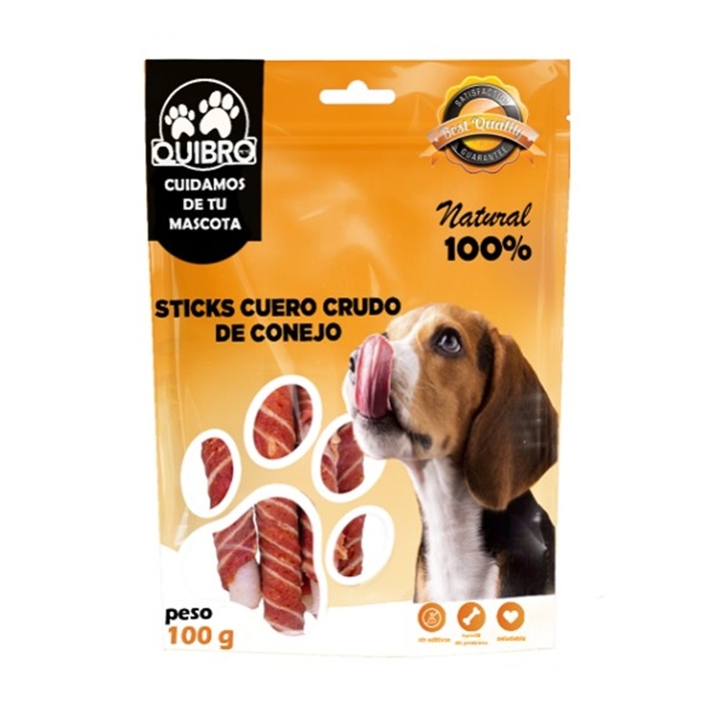 Snack en stick de cuero crudo con conejo para perros, un premio natural con gran sabor y una masticación que dura.