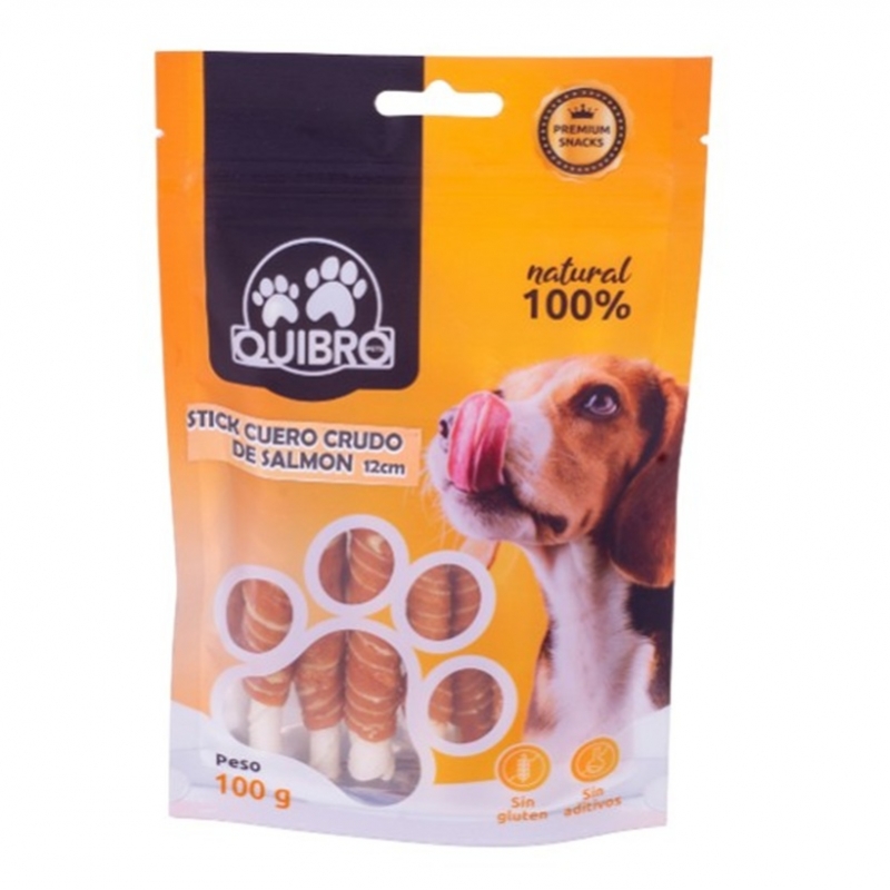 El stick de cuero crudo con salmón para perros es un snack natural pensado para completar su alimentación con una masticación intensa y muy sabrosa. Combina piel bovina con salmón y bacalao, aportando una mezcla de proteínas animales especialmente atractiva para perros que prefieren premios duraderos.