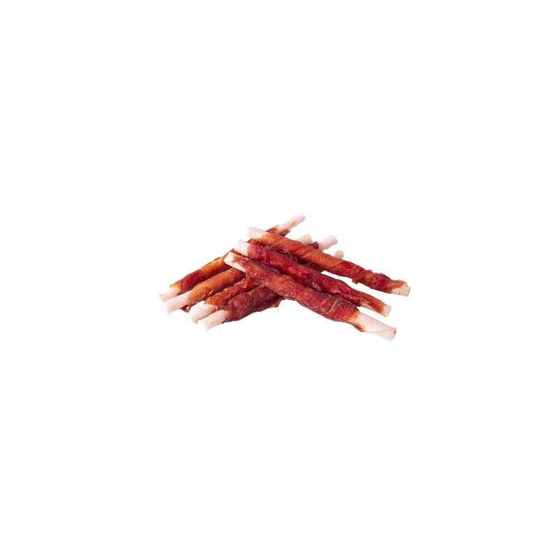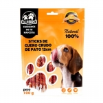 Snack de sticks de cuero crudo con pato para perros, un premio natural con masticación prolongada y un sabor muy marcado.