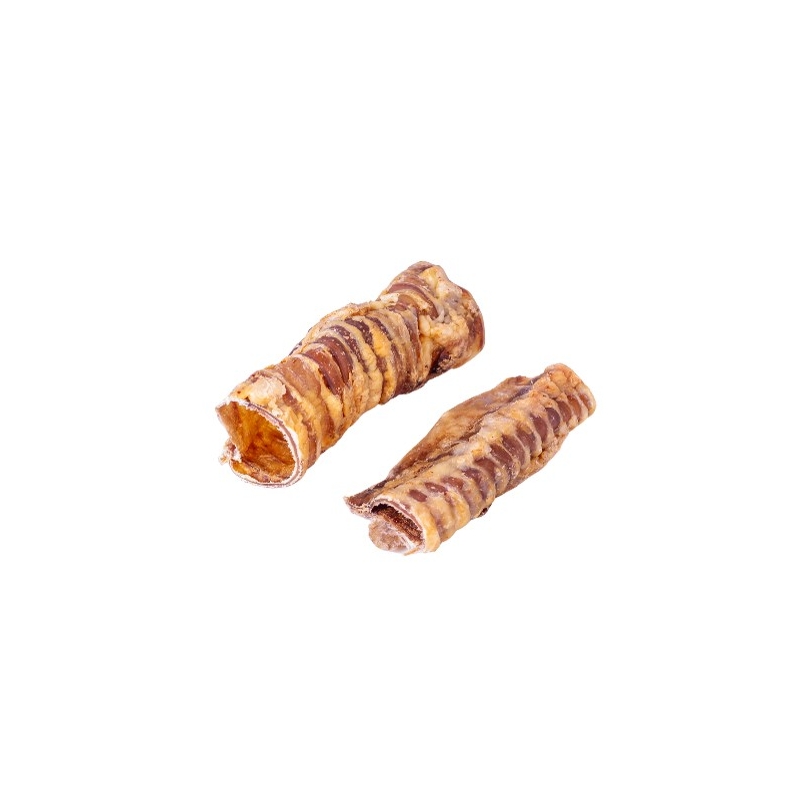 La tráquea de ternera para perros es un snack 100% natural elaborado únicamente con tráquea de ternera. Su estructura firme y a la vez flexible ofrece una masticación duradera, ideal para perros con gran instinto de roer y para quienes prefieren premios sin ingredientes añadidos.