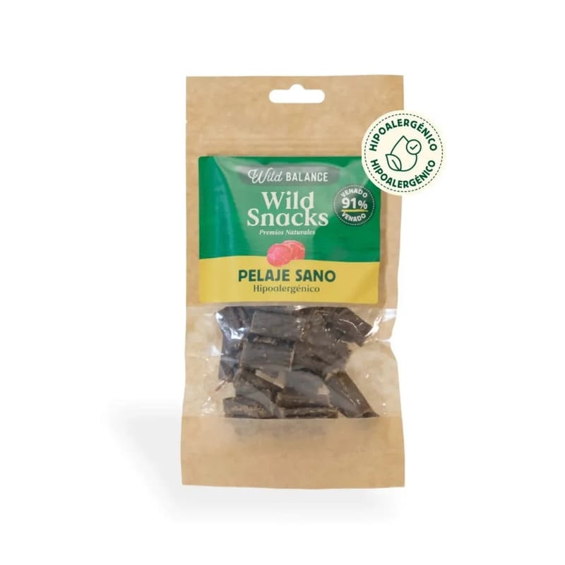 Wild Balance Wild Snacks Pelaje Sano de Venado es un snack hipoalergénico con 91% de venado, proteína magra y muy digestible, ideal para perros con piel sensible o alergias. Actúa desde dentro para favorecer una dermis equilibrada y un pelaje fuerte, brillante y suave.