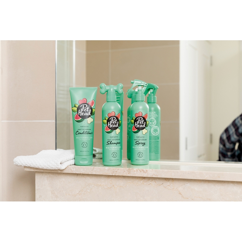 Acondicionador desenredante para perros de pelo largo elaborado con manteca de karité, aceite de albaricoque y melón Kalahari, que hidrata, suaviza y elimina enredos dejando el pelo brillante, manejable y con aroma fresco a sandía.