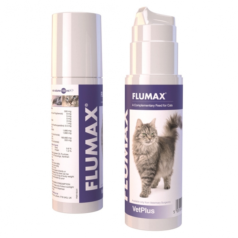 Flumax combina Lisina, Arandanos, Granada, Pelargonium, Zinc y Vitaminas del grupo B para aportar aminoacidos, antioxidante, apoyo inmunitario, regula el apetito, la energia y mejora los aportes al aparato respiratorio del gato. Flumax es una pasta muy sabrosa de facil administracion. Ayuda en casos de infecciones del aparato respiratorio, en larga administración reduce el riesgo de problemas respiratorios y previene la gripe del gato. Para Afecciones en vias respiratorias altas (Herpesvirus y Calcivirus).