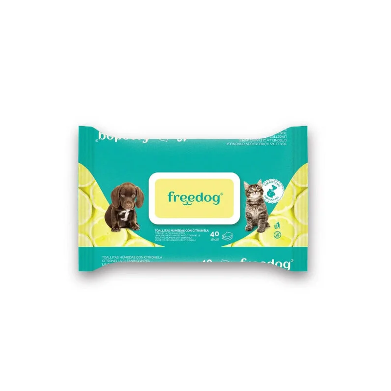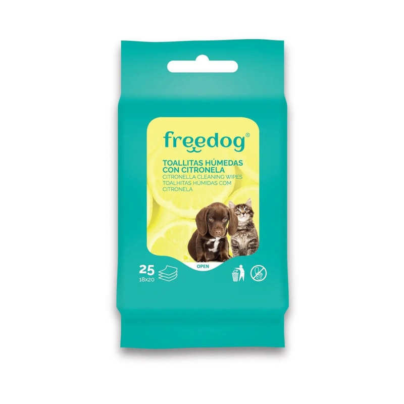 Toallitas con citronela natural para perros y gatos con vitamina E y aloe vera. Limpian pelo, patas y rostro dejando un aroma fresco y duradero, perfectas para paseos o viajes.