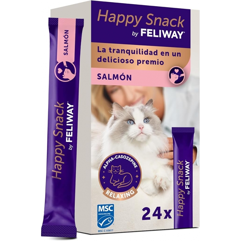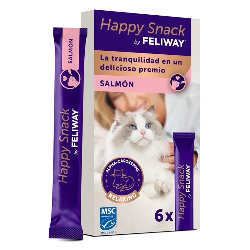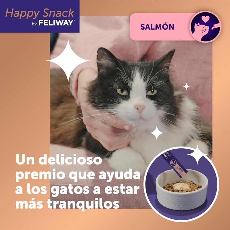 Happy Snack by Feliway es un snack cremoso con sabor a salmón creado para ayudar a los gatos a relajarse en su rutina. Incluye alfa-casozepina, una proteína natural derivada de la leche conocida por su efecto calmante.