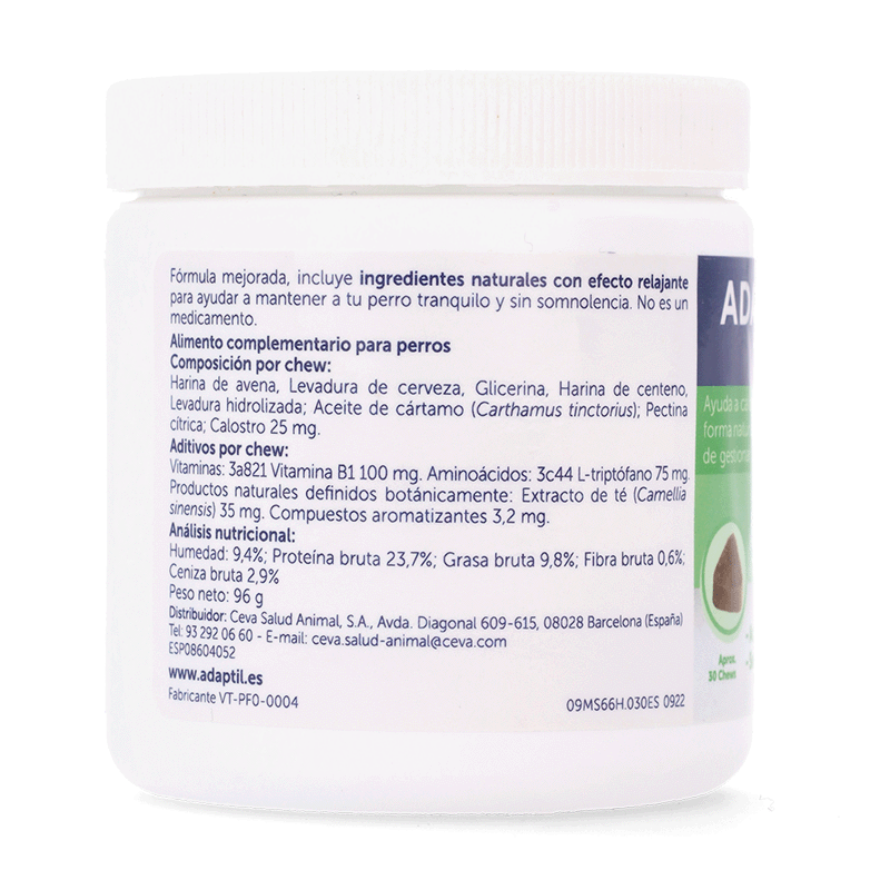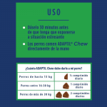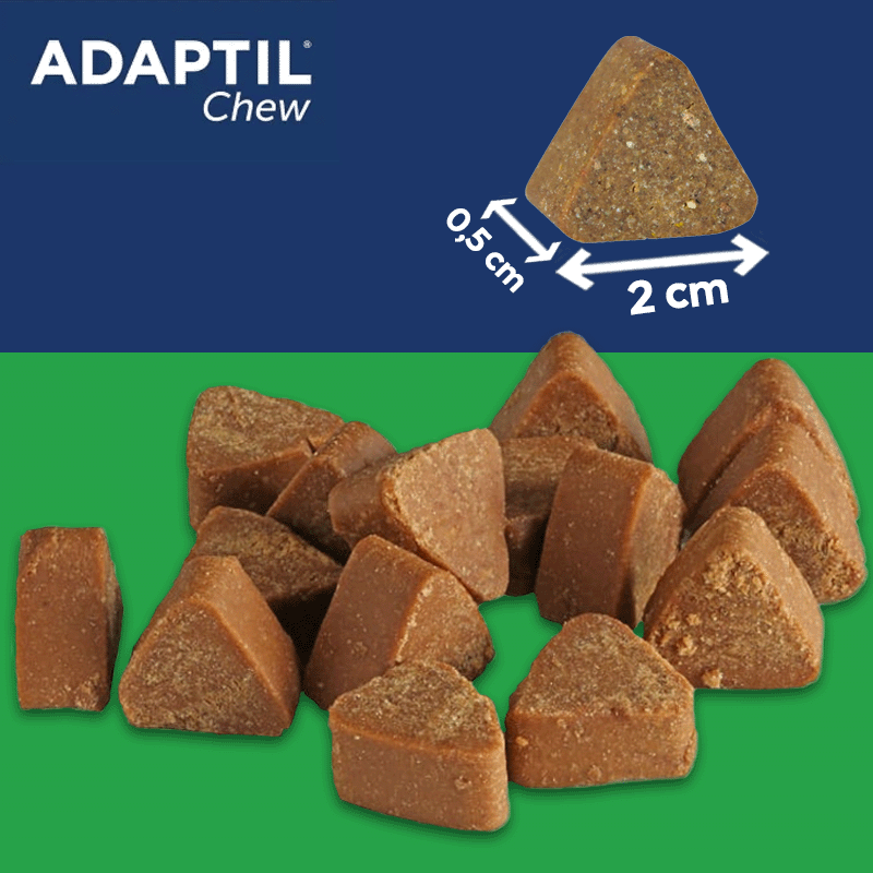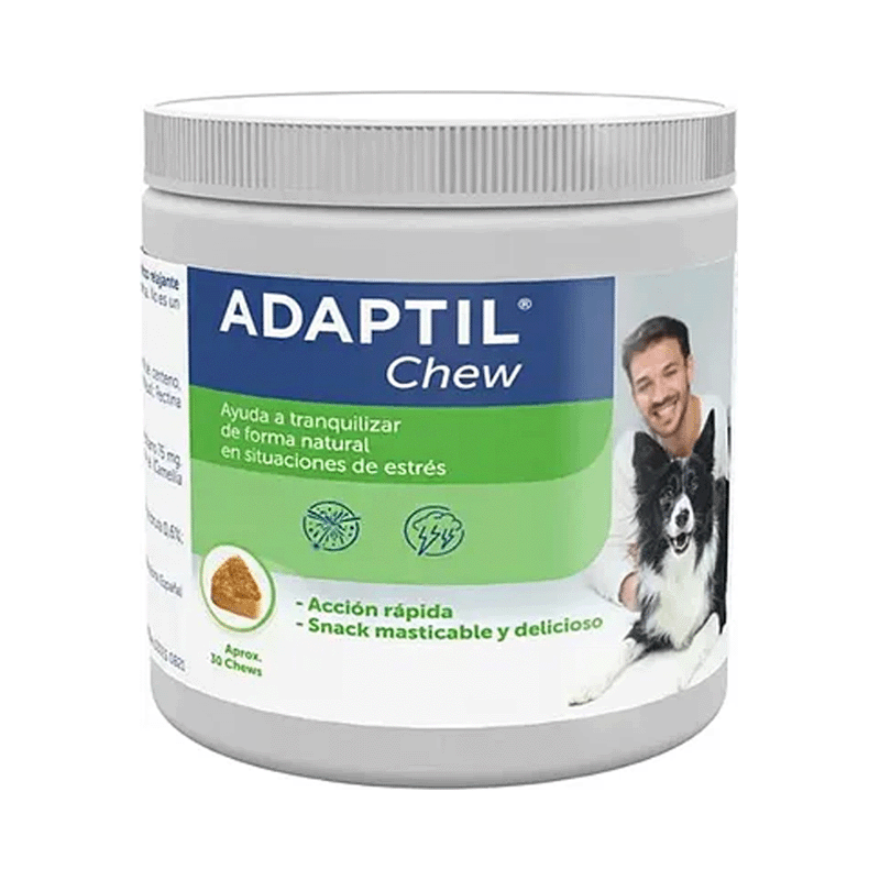 Presentamos ADAPTIL Chew, un suplemento natural especialmente diseñado para ayudar a tu perro a gestionar su ansiedad y estrés de forma rápida y efectiva. Si tu mascota sufre por ruidos fuertes, tormentas, viajes, visitas al veterinario o al salón de peluquería, este suplemento es la solución perfecta para mantenerlo tranquilo y relajado.