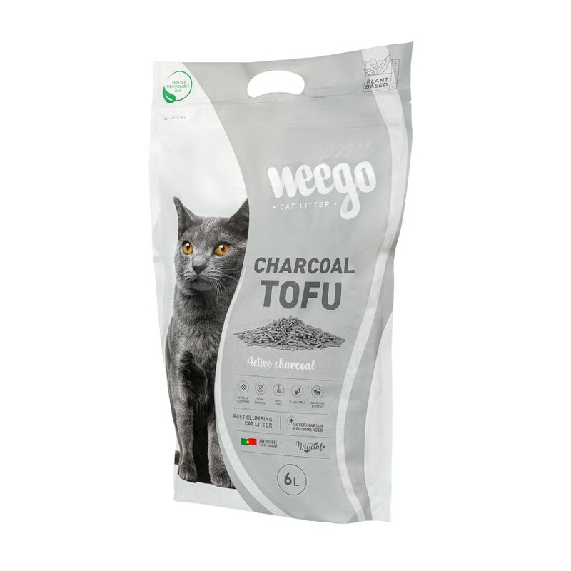 Weego Charcoal Tofu es una arena vegetal con tofu biodegradable y carbón activo que aglomera fácilmente, minimiza el polvo y neutraliza los olores, ofreciendo una textura suave y respetuosa con las patas del gato.