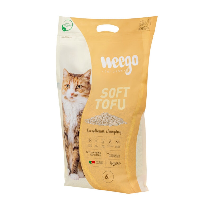 Weego Soft Tofu es una arena aglomerante fabricada con tofu 100% natural, biodegradable y muy suave para las patas, prácticamente sin polvo y eficaz para mantener los olores controlados.